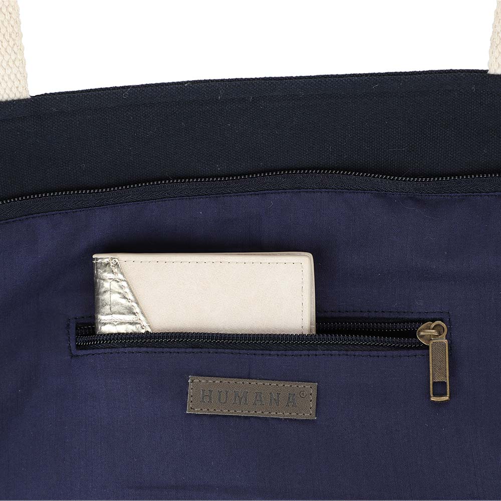 Cartera Humana Mirros hombro negra que pertenece la colección Neo Etnic. Es de vanvas printeado con figuras geometricas. Tiene un bolsillo principal con cierre y un bolsillo frontal con detalles en mostacillas y flecos.