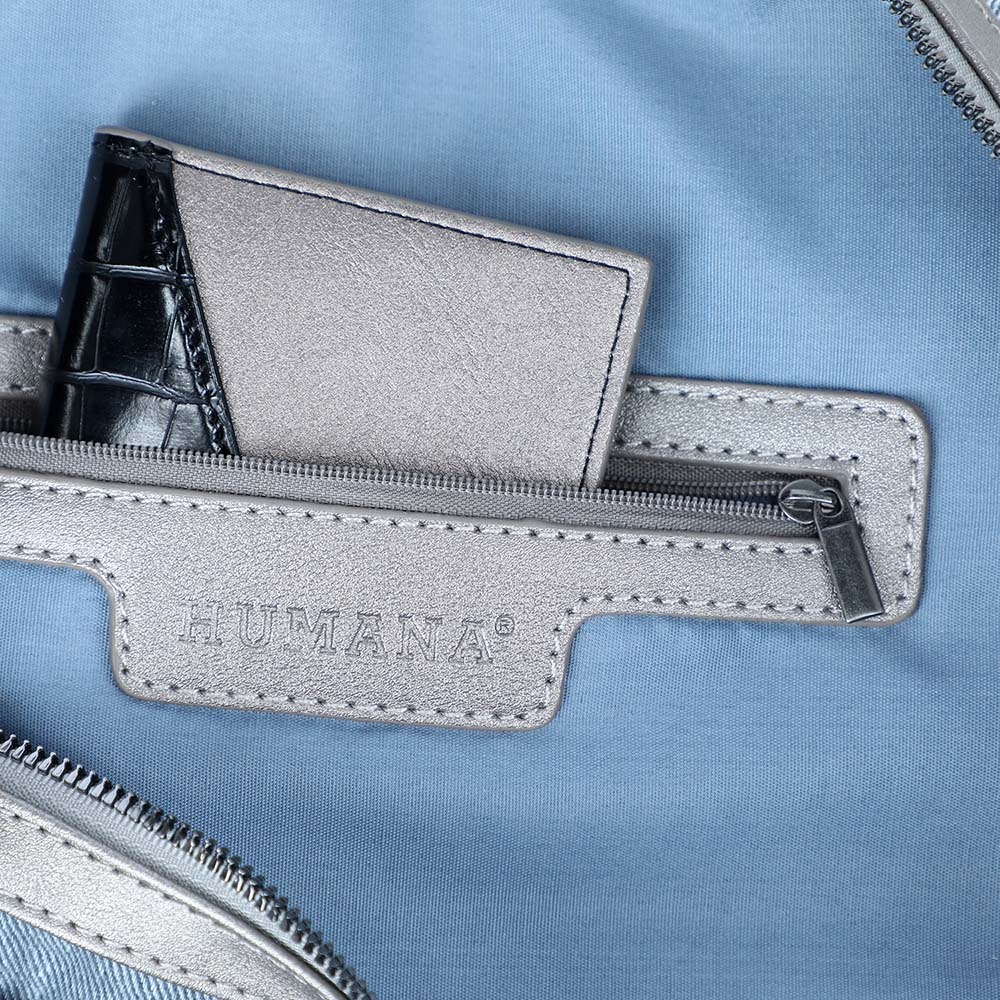 Bolso Humana Ocean azul que pertenece a la colección Verdigris Pearlescent. Es de canvas con detalles en cuero vegano plateado. uenta con un cierre principal con 2 compartimentos en su interior. Tiene asas regulables y desmontables.