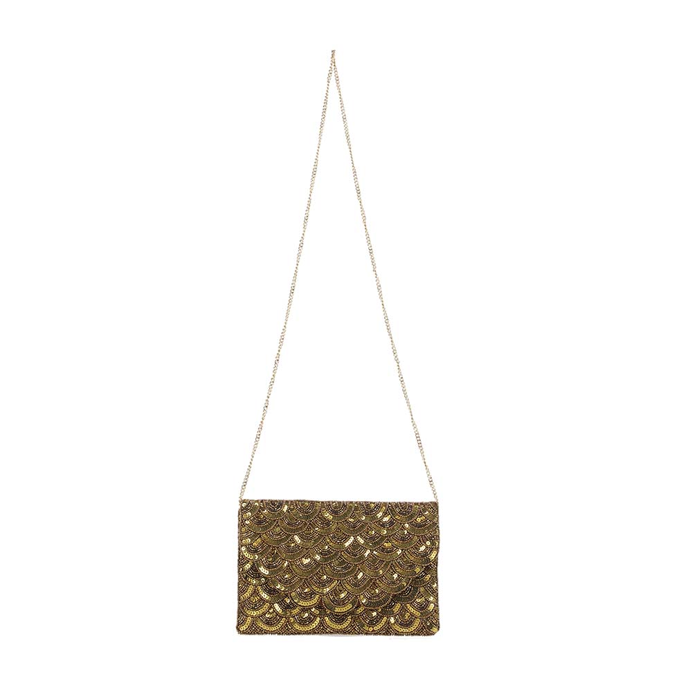 Clutch Humana Impala dorado que pertenece a la colección Luscious Marrakesh. Bordado con mostacillas y lentejuelas doradas que crean un maravilloso diseño texturado. Tiene un bolsillo interior y una cadena dorada para usarlo cruzado o como más te acomode. Ideal para tus salidas nocturna.
