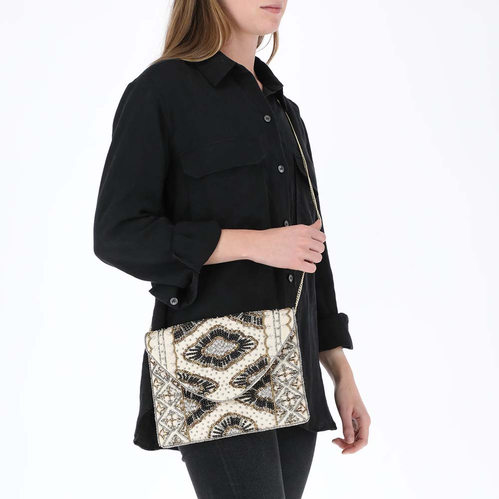 Clutch Humana Infinity beige que pertenece a la colección Zodiac. Bordado con mostacillas negras, doradas y plateadas que crean un maravilloso diseño texturado. Tiene un bolsillo interior y una cadena dorada para usarlo cruzado o como más te acomode. Ideal para tus salidas nocturna.